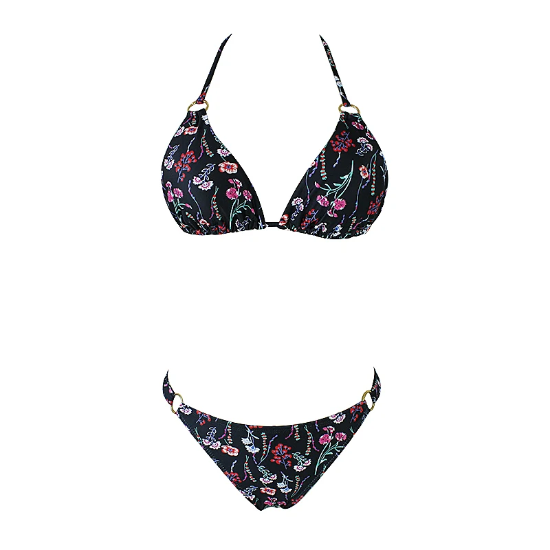 Floral pattern and lovely spells that last, this two-piece set is bold and flirty. It features double straps making a halter neckline and a plunging front. The low-rise bottoms have string ties on the sides and a minimal coverage. Pair it with your sass for a confident look.