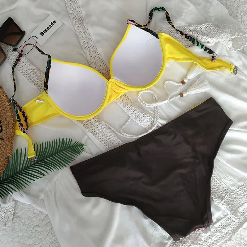Swimsuit in combination color: yellow-brown.